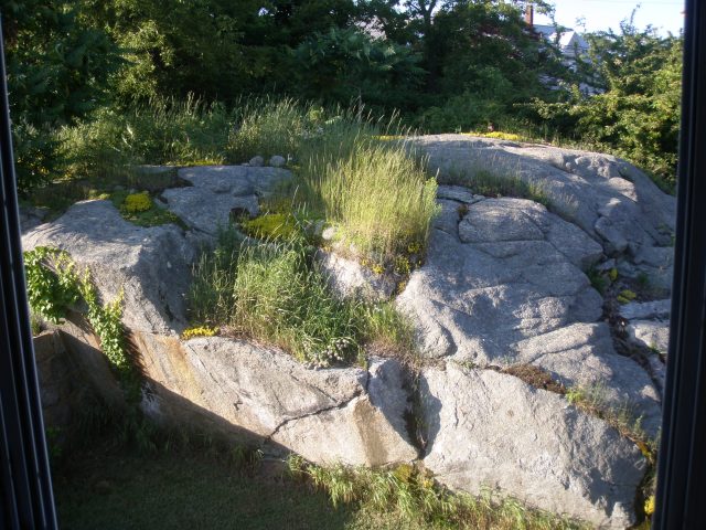 A fair-sized granite heap occupies much of the view out my second-floor study’s east window. By Cape Ann standards it is not very big; still, the portion above ground could be compared to two or three bungalows pushed together. Wickedly thorned blackberry vines proliferate on and around this mass of granite and would completely overrun it if I did not keep them in check. For that reason—and because I like the sound—I call it Blackberry Rock.